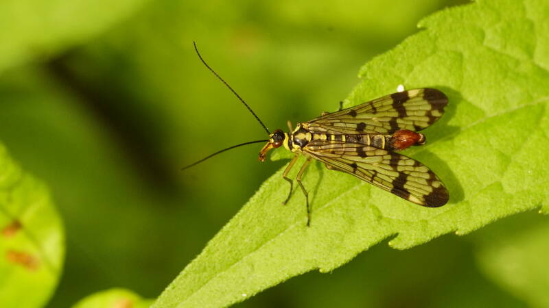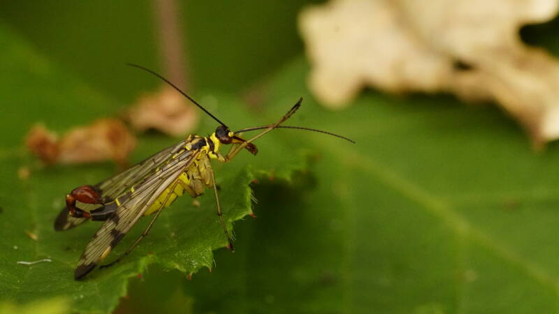 Hij heeft een lengte van 30 mm.[1] Het is een geel insect met zwarte brede rechthoekige vlekken op de rug. Aan de kop zit een lange rode snuit waarmee het kleine insecten eet. De vleugels zijn doorzichtig met zwarte vlekken, die in vergelijking met de Duitse schorpioenvlieg groter en vollerzijn. De soort toont veel gelijkenis met Panorpa vulgaris. De mannetjes hebben een schorpioenachtig uiteinde aan de staart. Bij de vrouwtjes is dit afwezig.