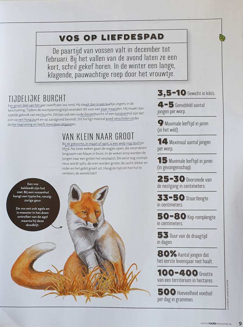 Een vos is maar weinig groter dan een flinke kat, hoewel hij door zijn lange vacht en dikke staart vooral 's winters bedrieglijk groot lijkt. De vos heeft een oranjebruine, rode of bruingrijze vacht, korte poten en een langgerekt lichaam. De rug is donkerder dan de flanken en de buik is grijs tot bijna wit. Hij heeft een dikke, lange staart vaak met een witte punt. Hij heeft grote puntige oren die aan de achterzijde zwart zijn, een zwart-witte snuit en amberkleurige ogen. De wintervacht is veel dikker dan de zomervacht en meestal grijzer van kleur. De vos heeft een goed gehoor en reuk maar ziet minder scherp. In april worden de jongen geboren en eind april/begin mei komen ze naar buiten.